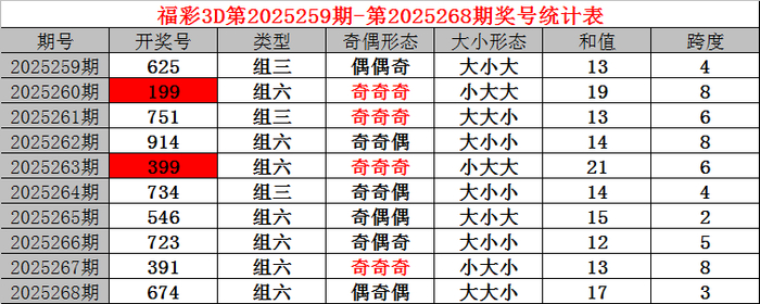 上期回顾:福利彩票3D第2025268期开奖结果674。奖号:偶奇偶、大大小,和值17,跨度3。